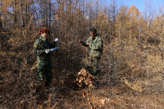包鹏 摄 10月19日,森防站测报组技术员根据气候变化,结合兴安落叶松鞘蛾的生活史规律,在生态功能区四方山景区落叶松标准地进行监测调查。 [来 源:高荣红] |